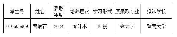 我校高等学历继续教育2025级学生曾炳花因个人原因,于2024年12月向我校提出转学(转出)申请,根据《普通高等学校学生管理规定》(教育部令第41号)精神,经研究,我校拟同意该生转学(转出)申请。具体情况公示如下: 公示时间:2025年1月2日至2024年1月8日。如有异议,请在公示期内实名向我院学历教育部反映。联系人:刘老师,联系电话:020-85215258。 华南师范大学继续教育学院 2025年1月2日 华南师范大学成人高考网上报名入口 |