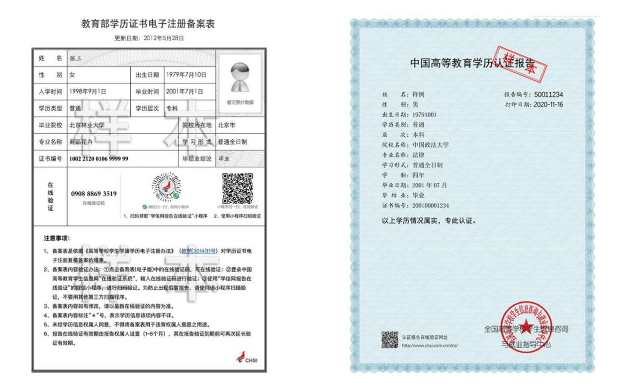 《中国高等教育学历认证报告》或《教育部学历证书电子注册备案表》样式